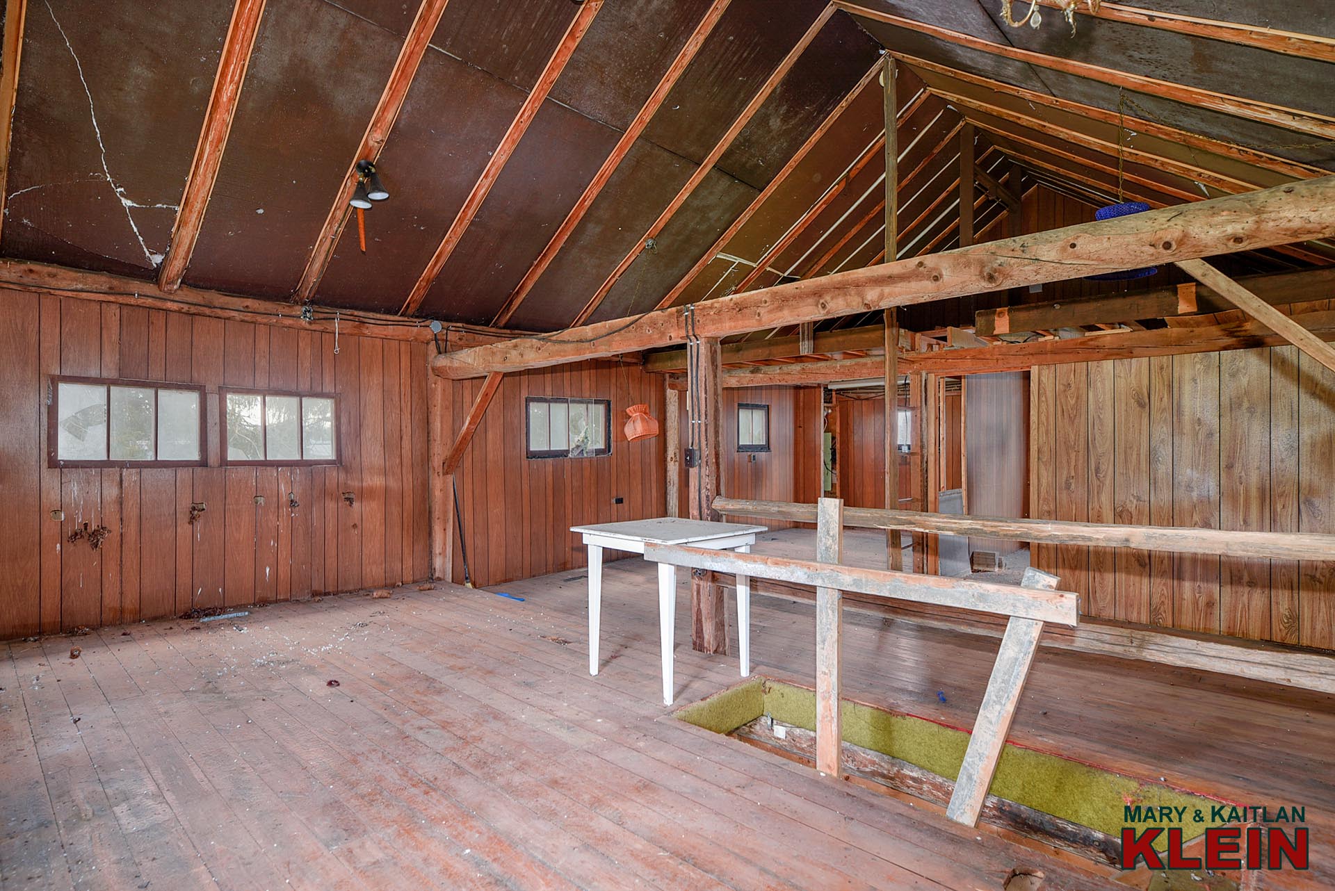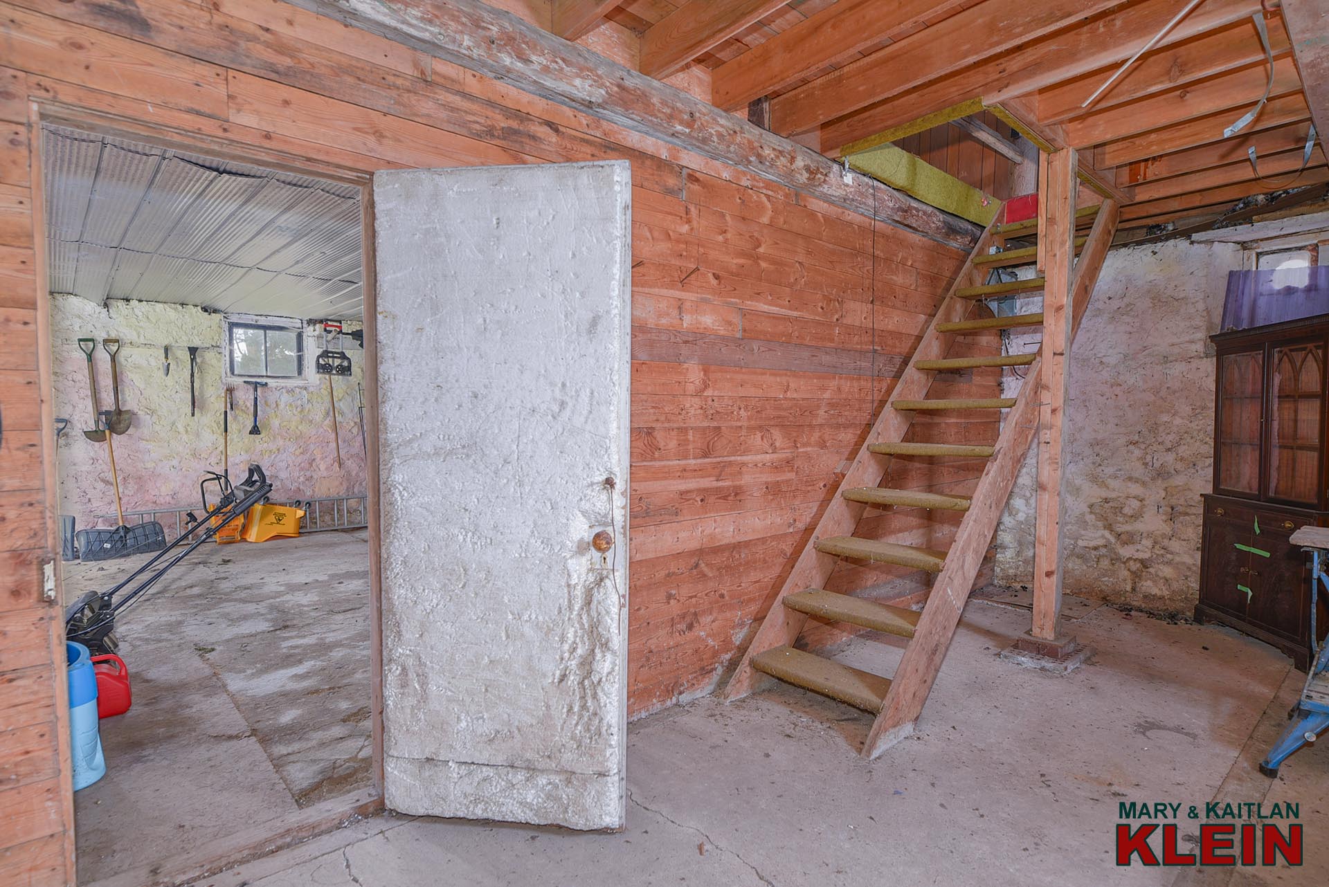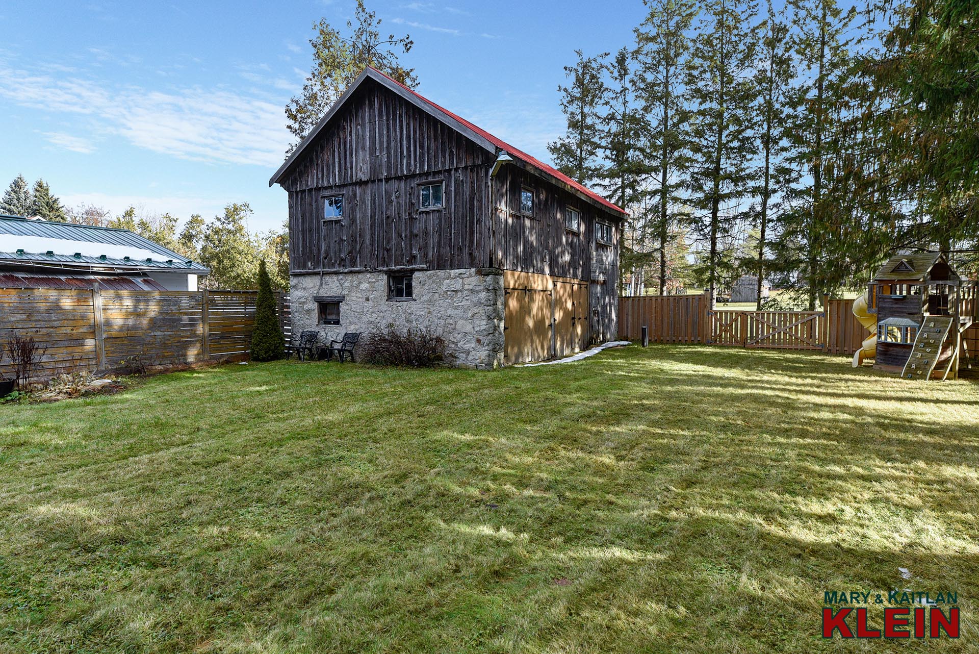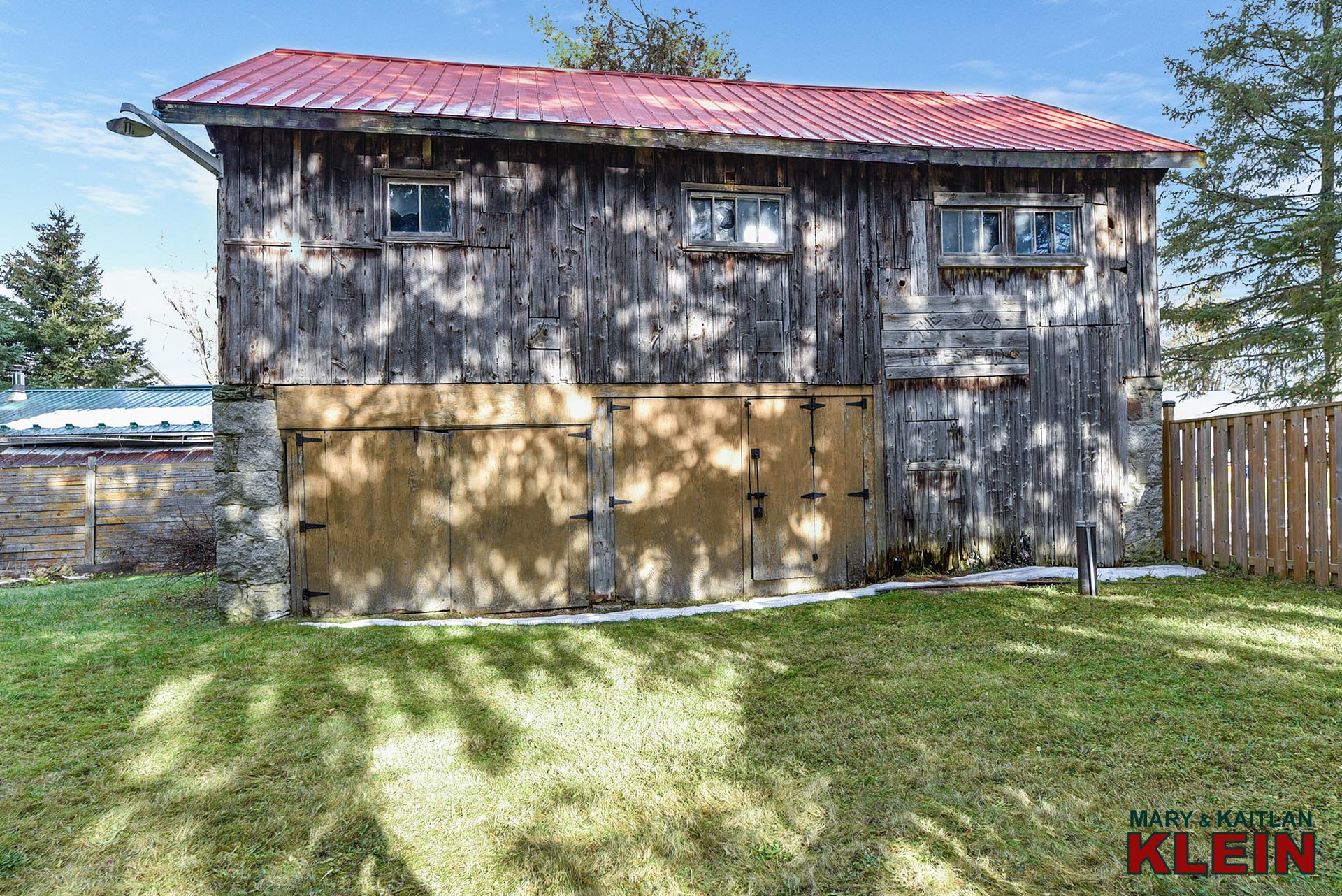 A detached approximately 34 ft. x 21 ft. barn/workshop with rustic stone walls has hydro and offers two levels of versatile workspace and storage.