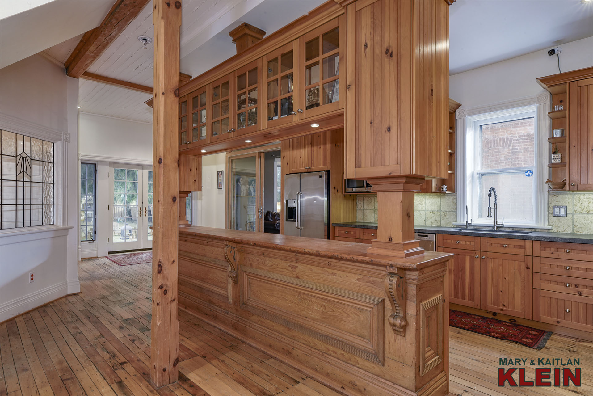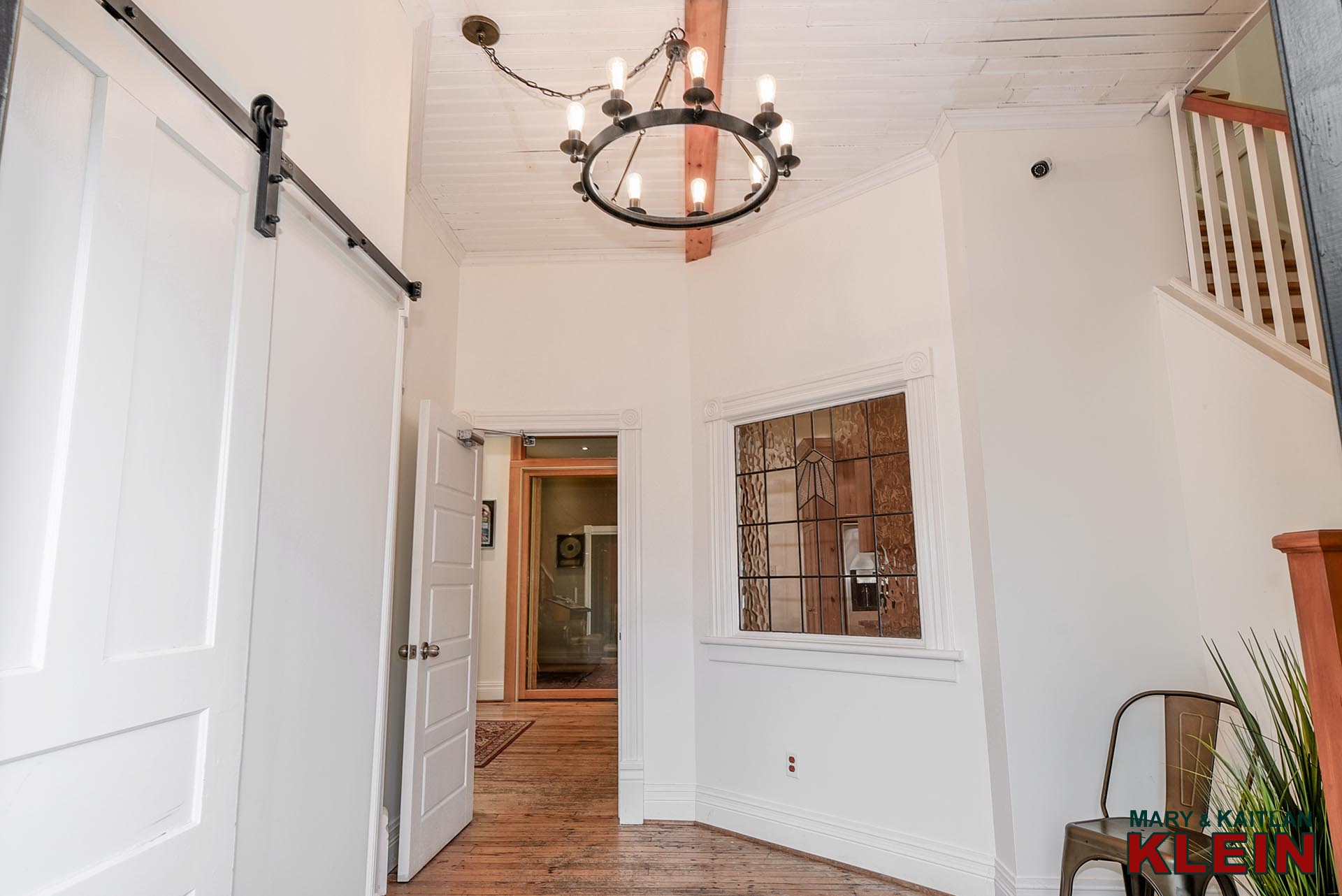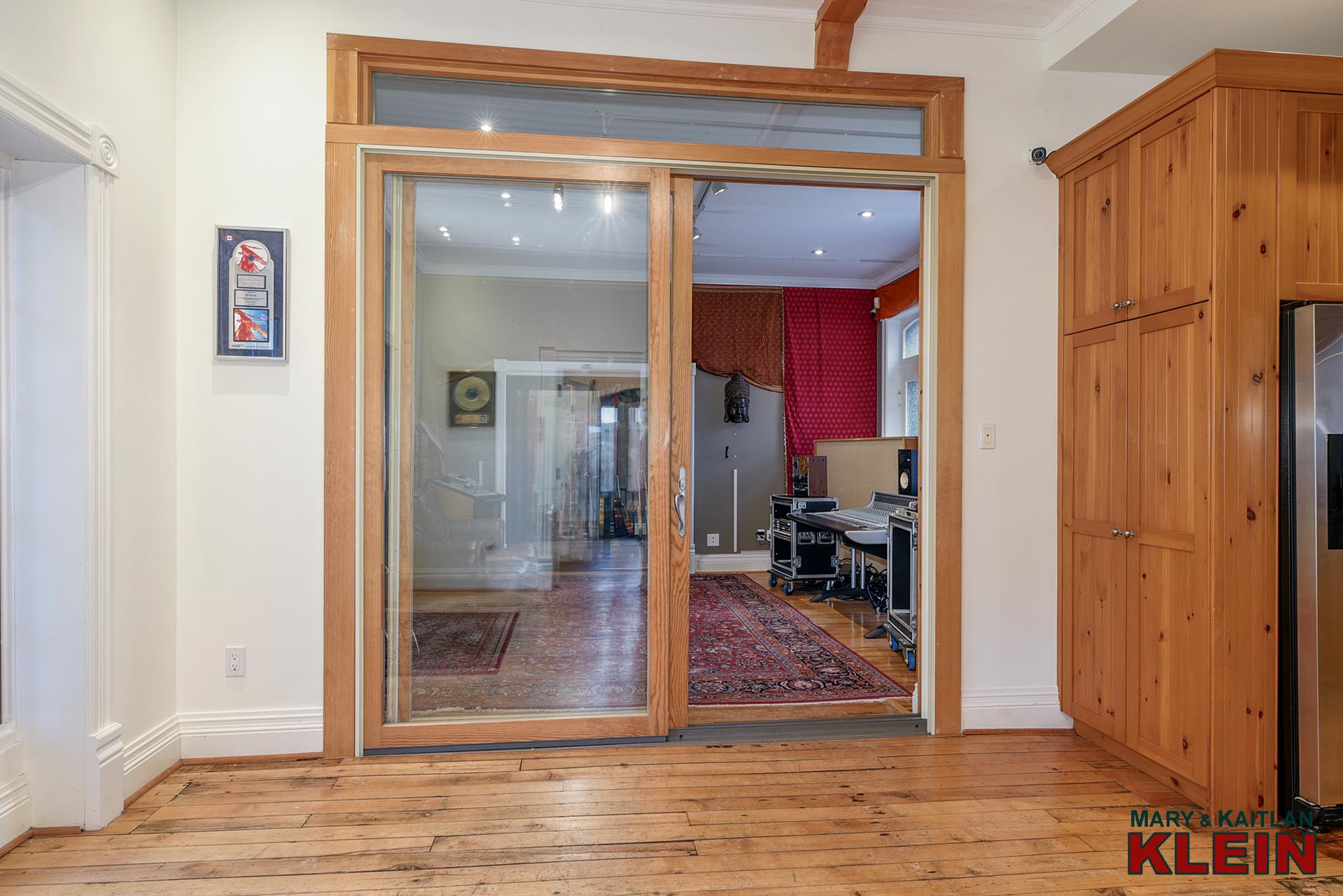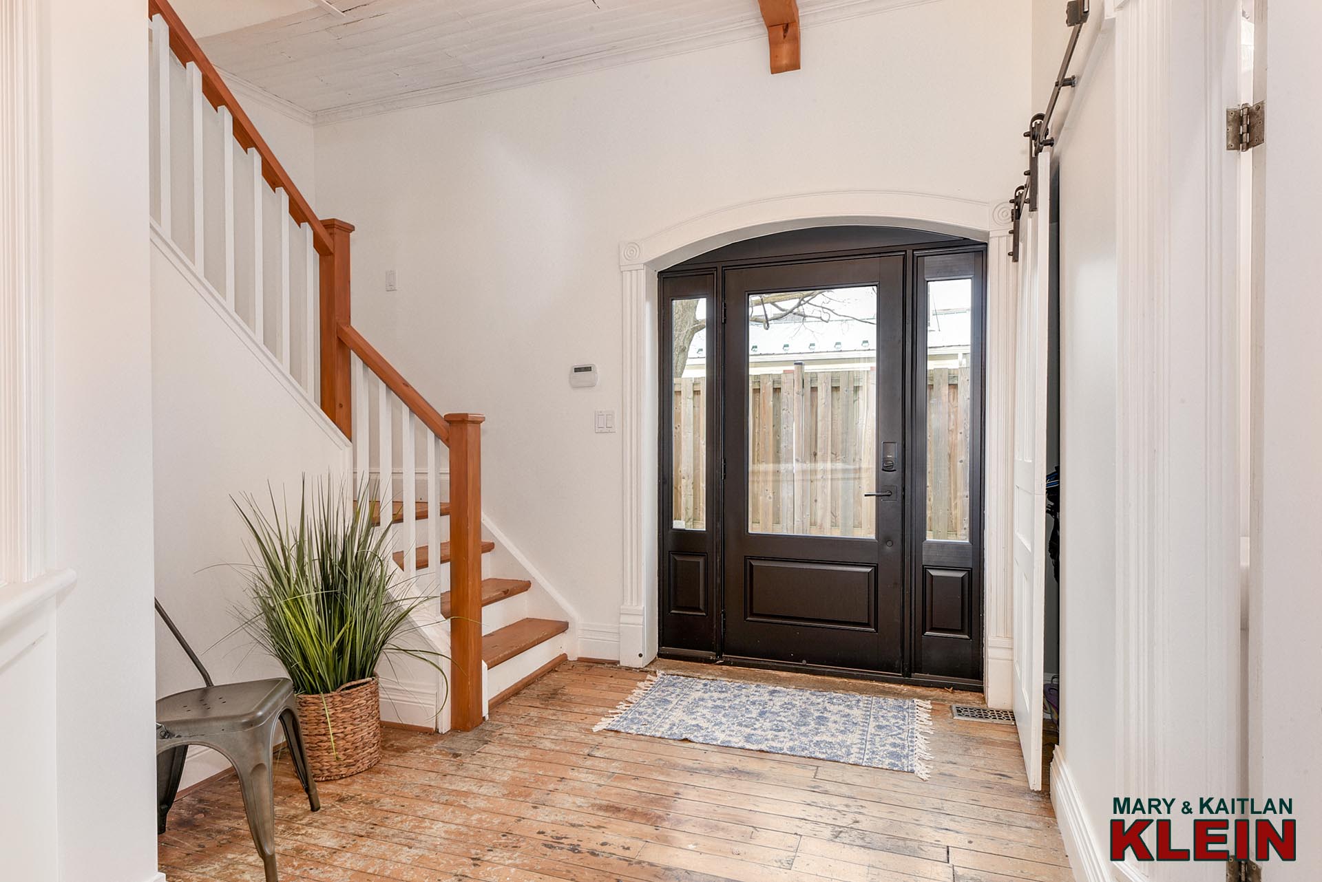 The Foyer is located off the driveway and features a beautiful custom front door (‘24). Original maple wood floors, pot lighting, a stained-glass focal point,10 ft. ceilings with rustic wooden accent beams welcome you to this impeccably maintained home exuding warmth and character.