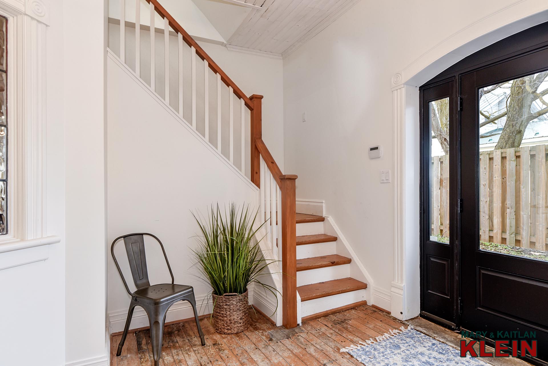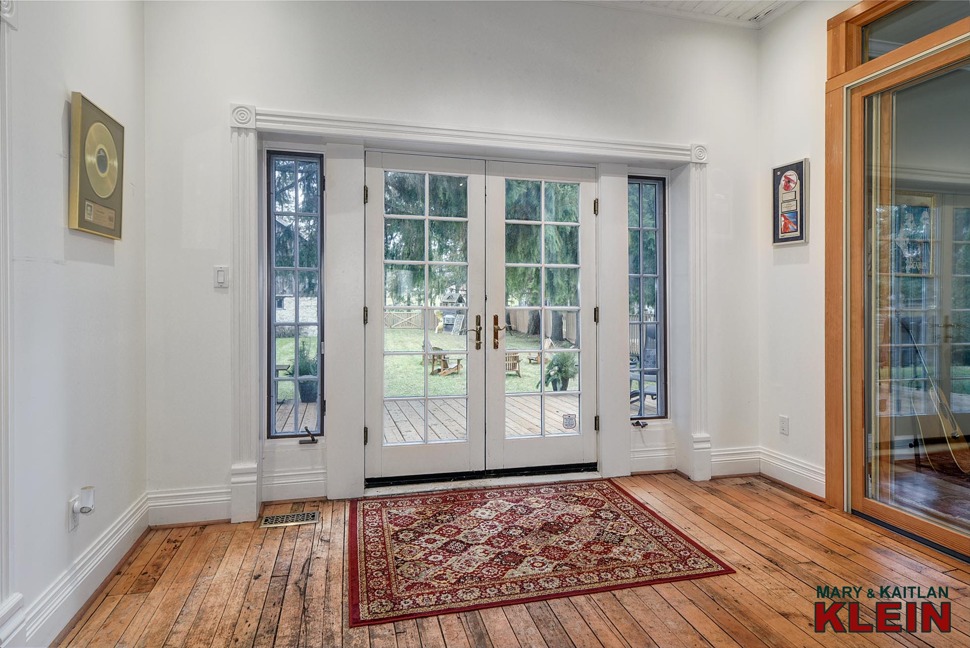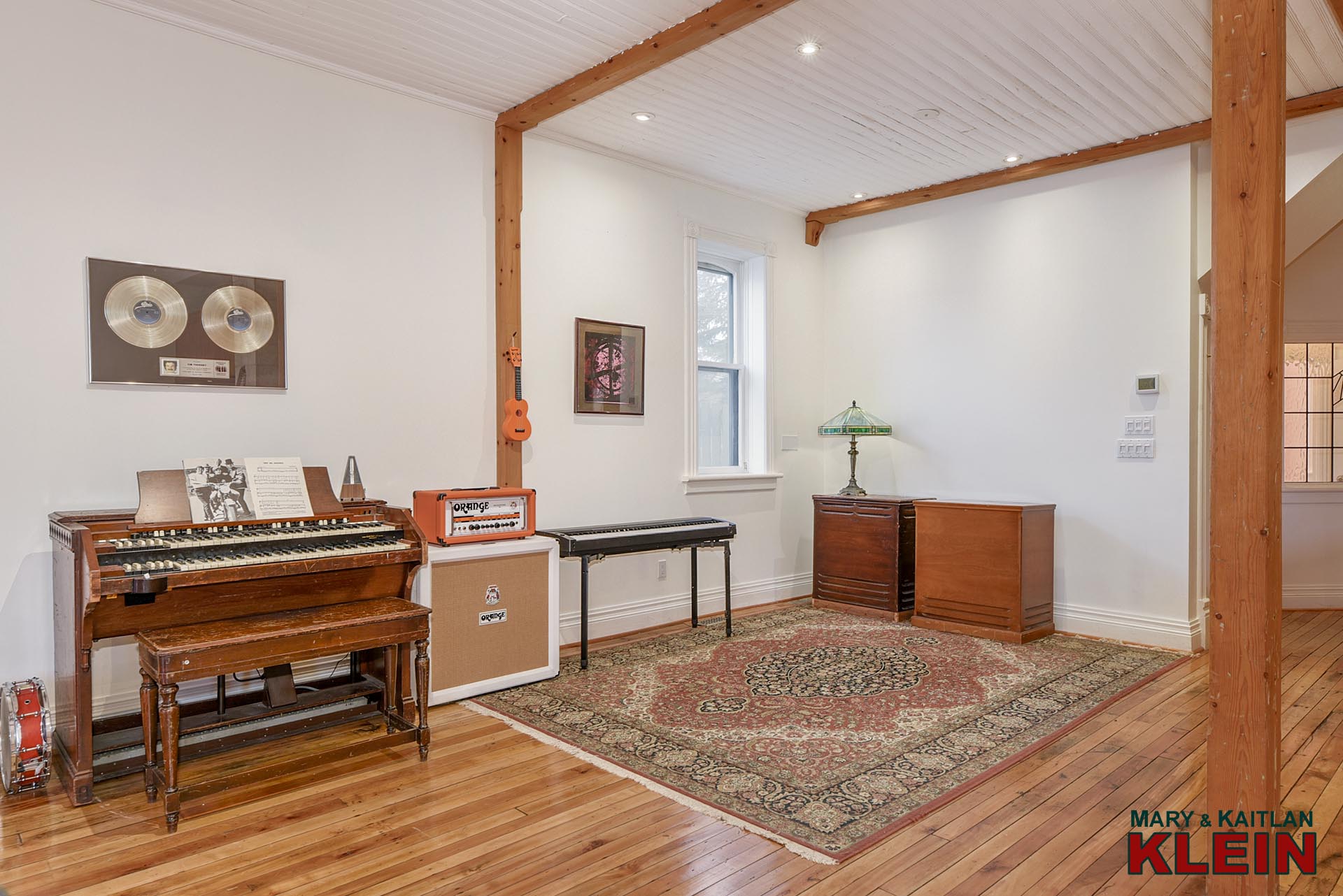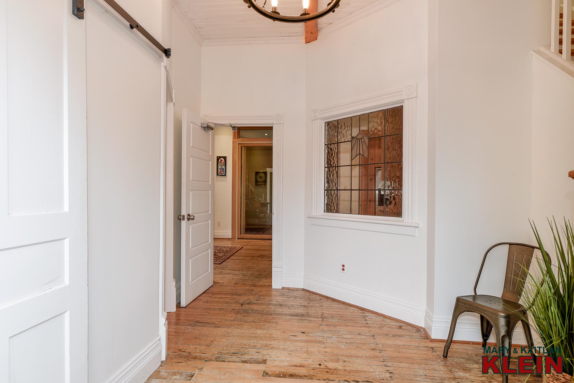 The Foyer is located off the driveway and features a beautiful custom front door (‘24). Original maple wood floors, pot lighting, a stained-glass focal point,10 ft. ceilings with rustic wooden accent beams welcome you to this impeccably maintained home exuding warmth and character.