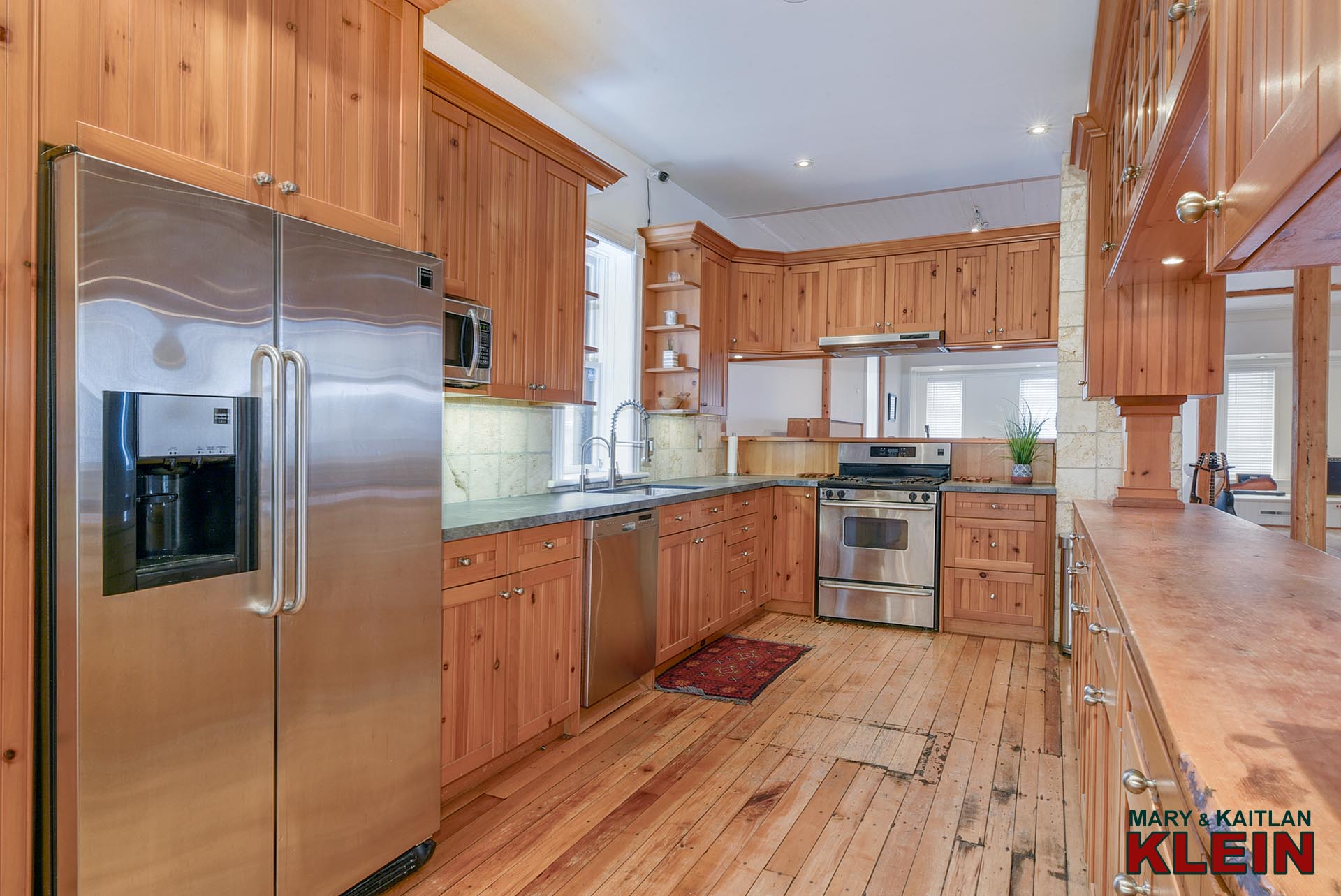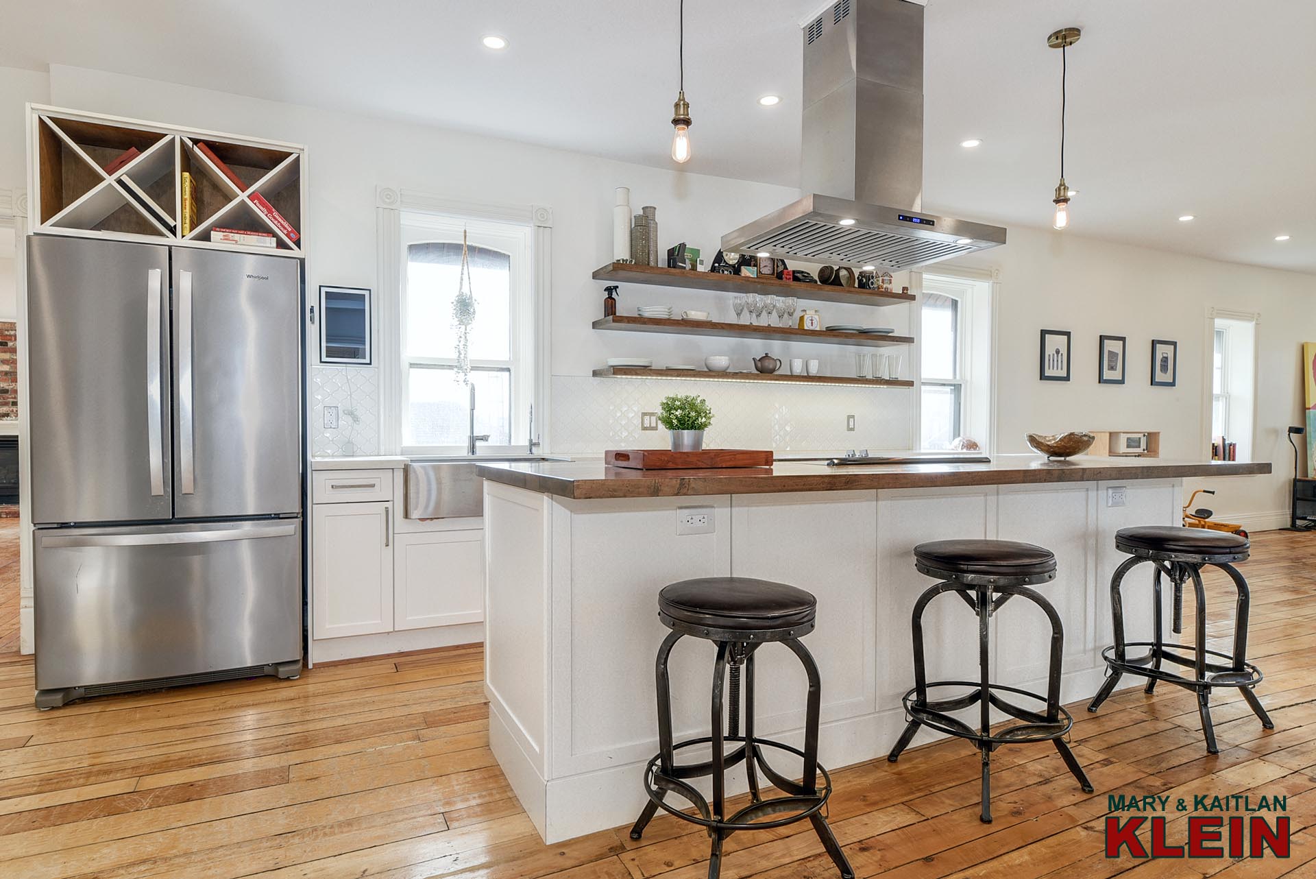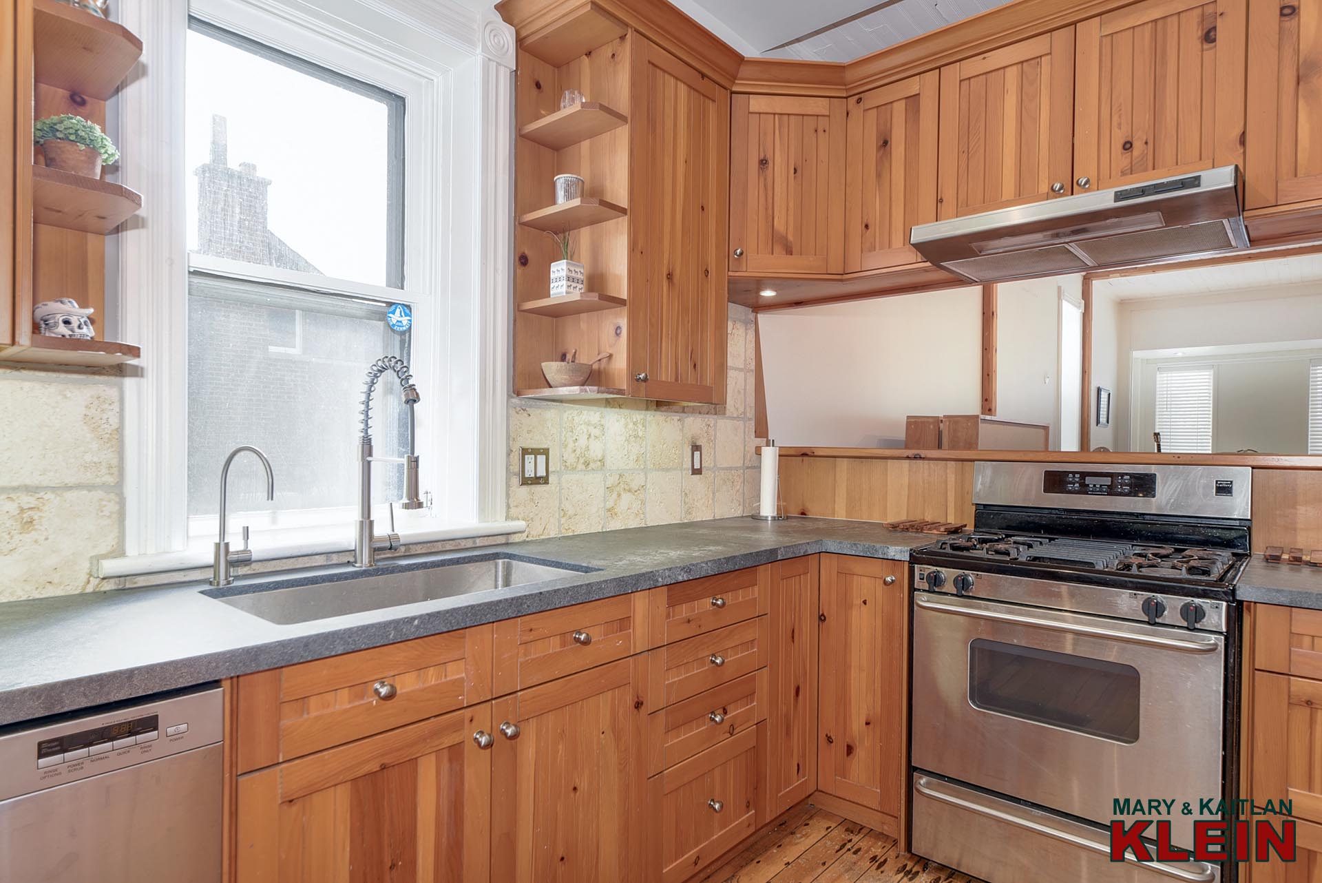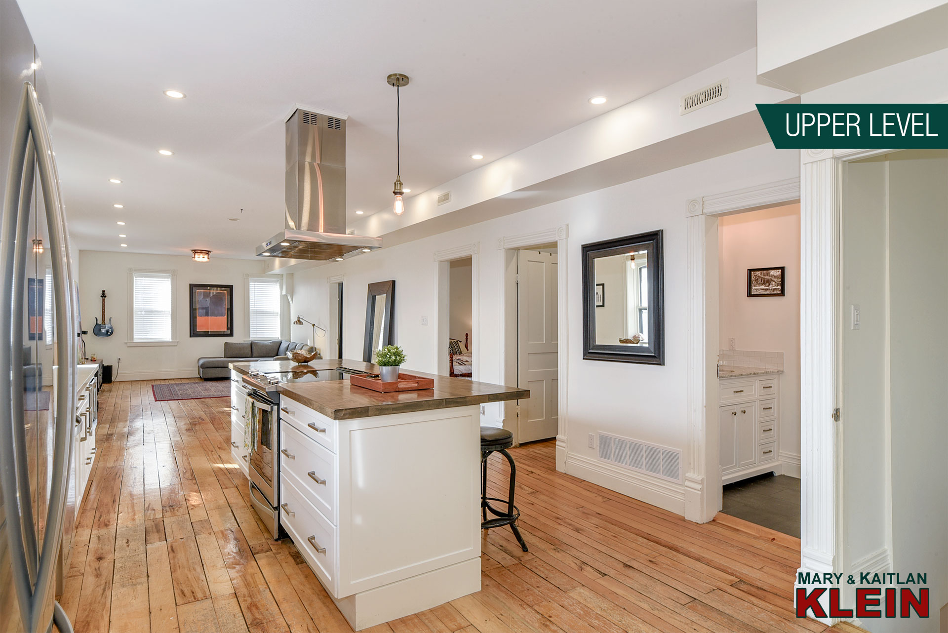 Renovated by Alair Homes in 2019, the upstairs features refinished maple flooring, a custom Kitchen with a farmhouse sink, quartz and butcher block countertops, tile backsplash, pot lighting, a breakfast bar and is open to the large Living room.