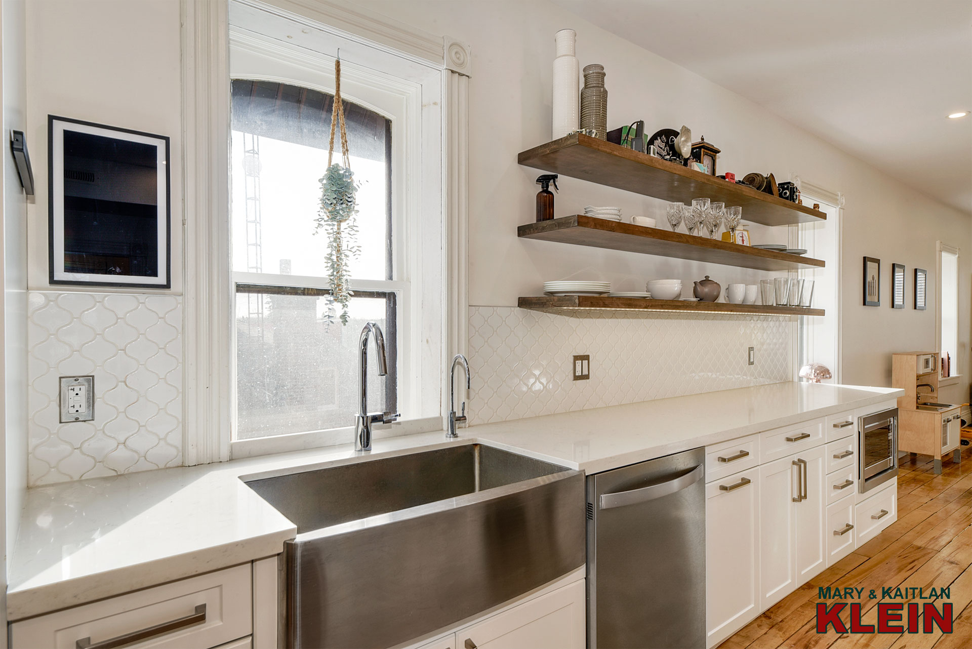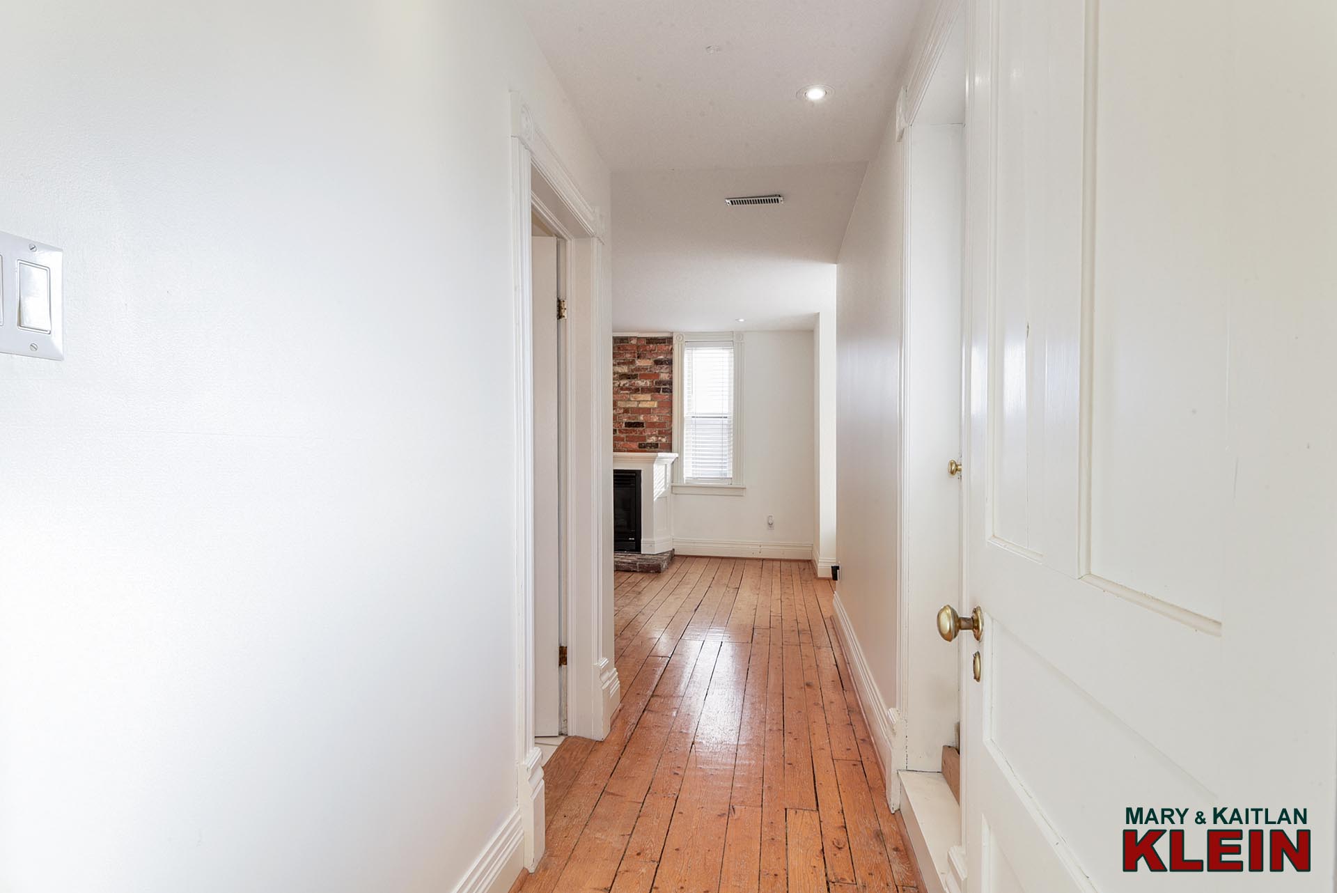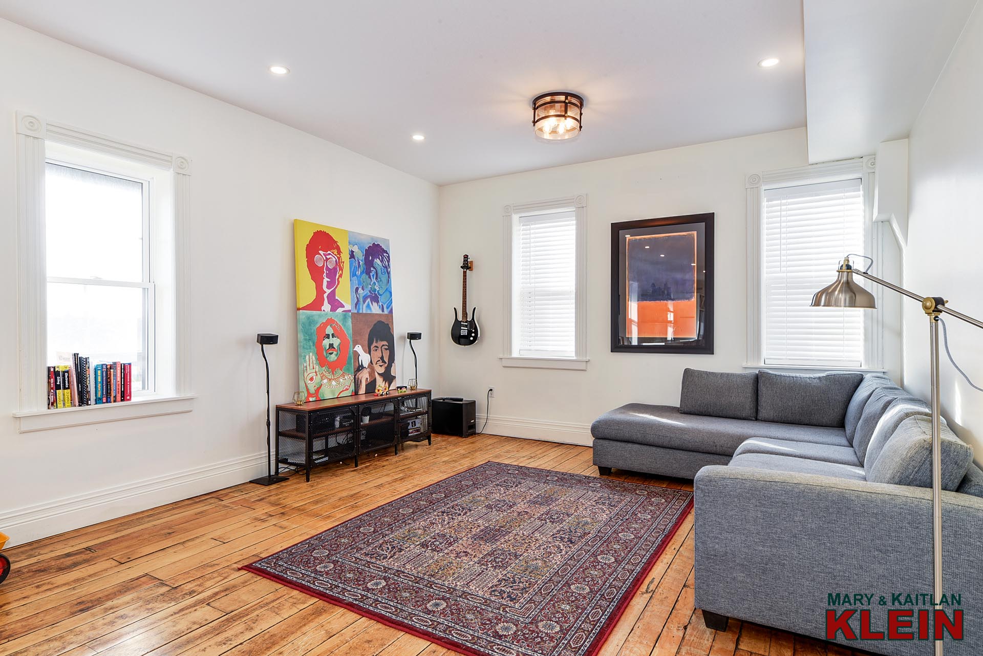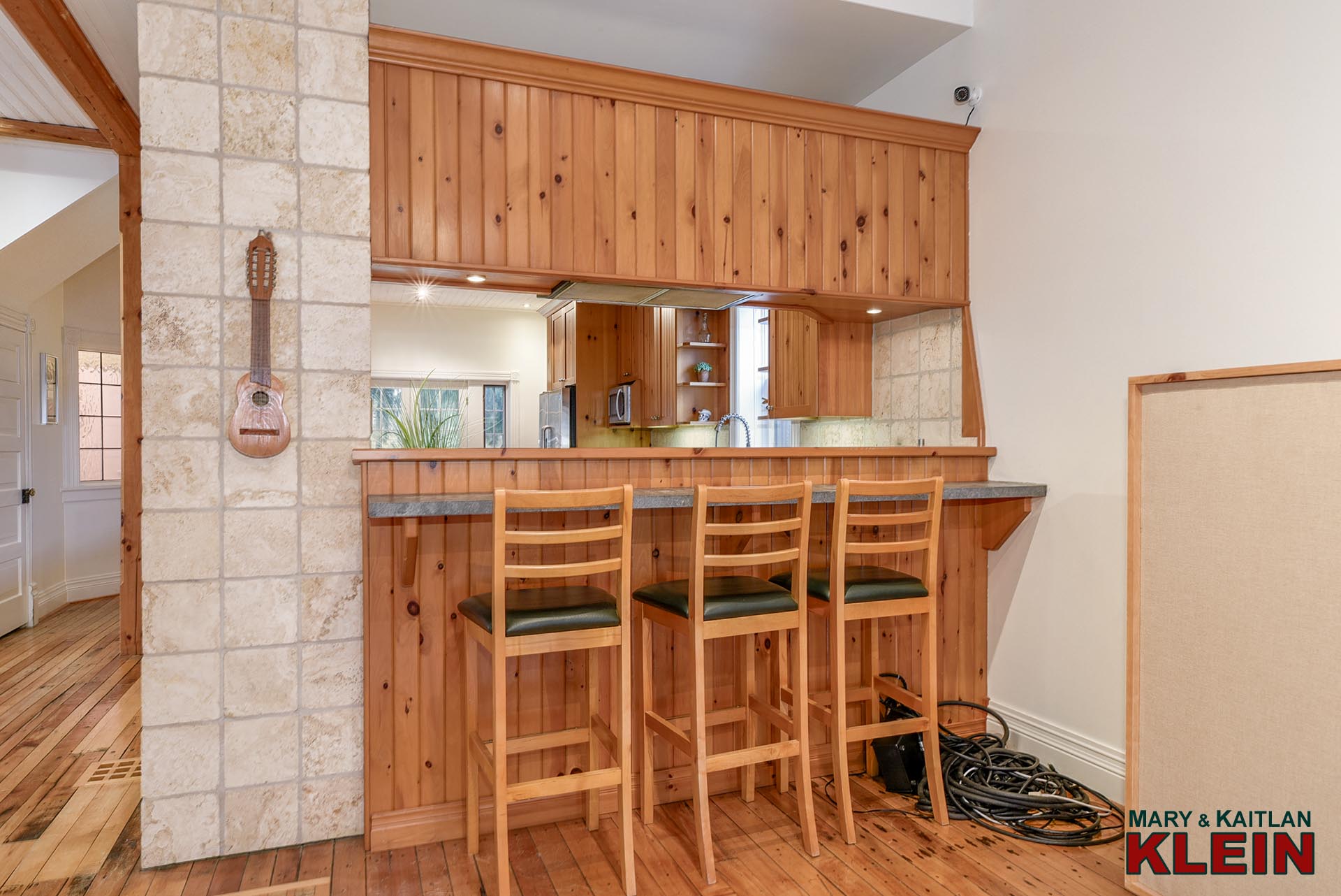Renovated by Alair Homes in 2019, the upstairs features refinished maple flooring, a custom Kitchen with a farmhouse sink, quartz and butcher block countertops, tile backsplash, pot lighting, a breakfast bar and is open to the large Living room.