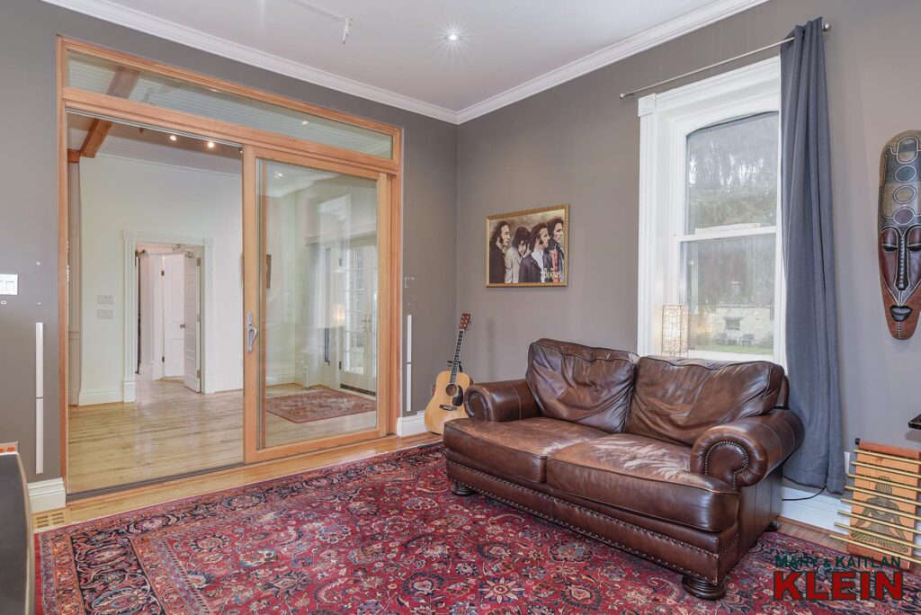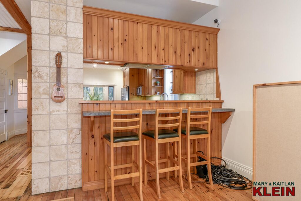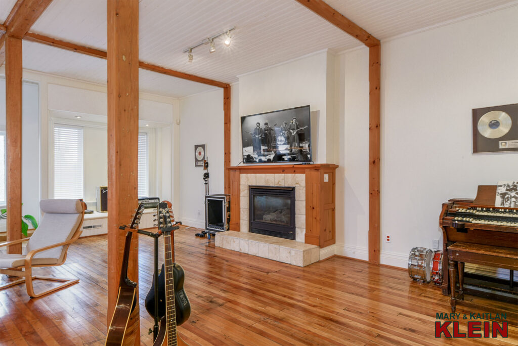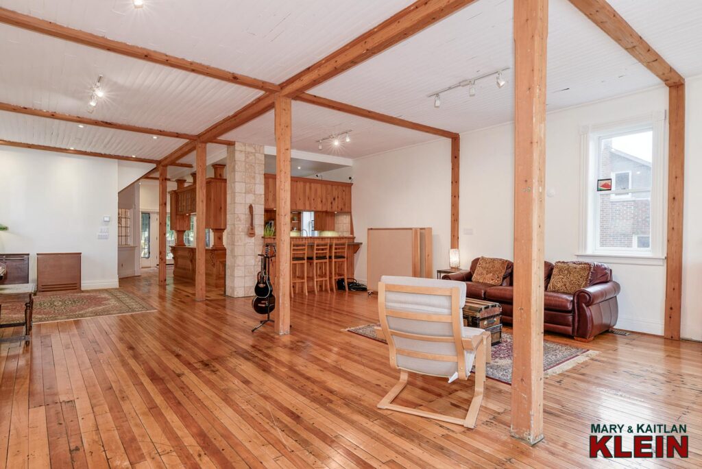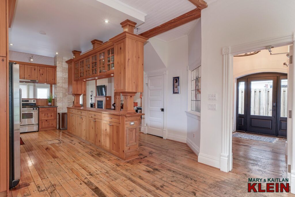 The Foyer is located off the driveway and features a beautiful custom front door (‘24). Original maple wood floors, pot lighting, a stained-glass focal point,10 ft. ceilings with rustic wooden accent beams welcome you to this impeccably maintained home exuding warmth and character.