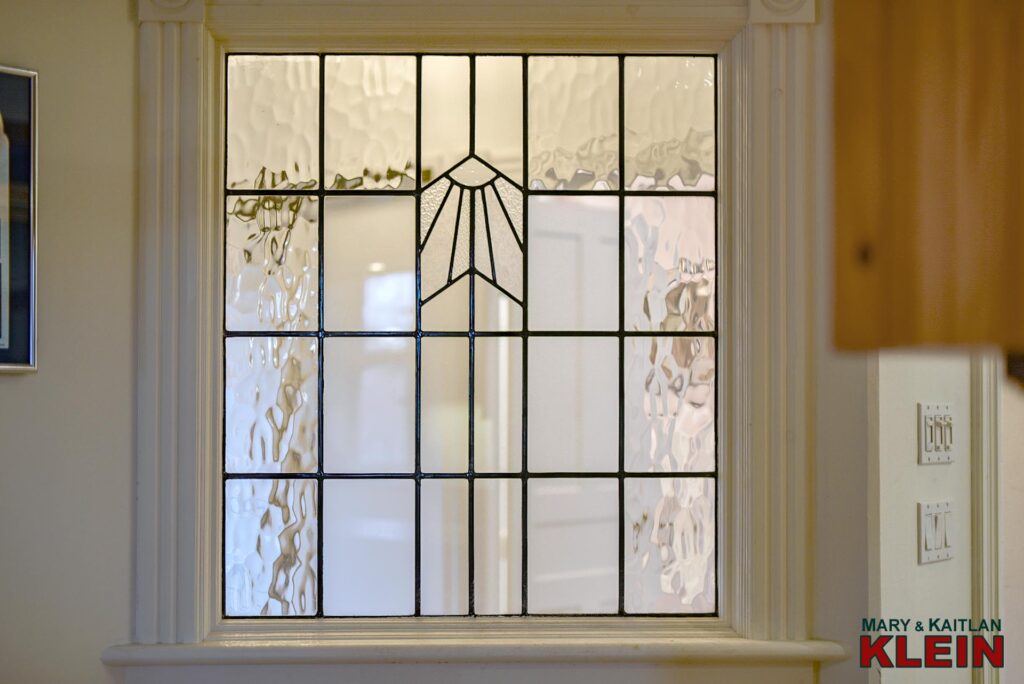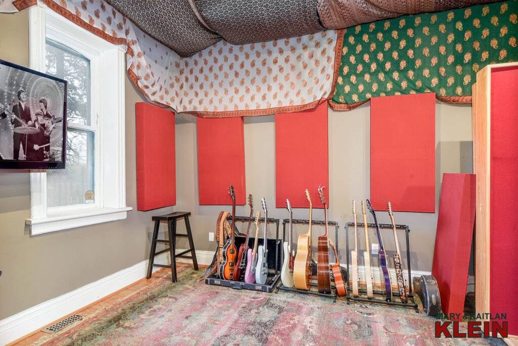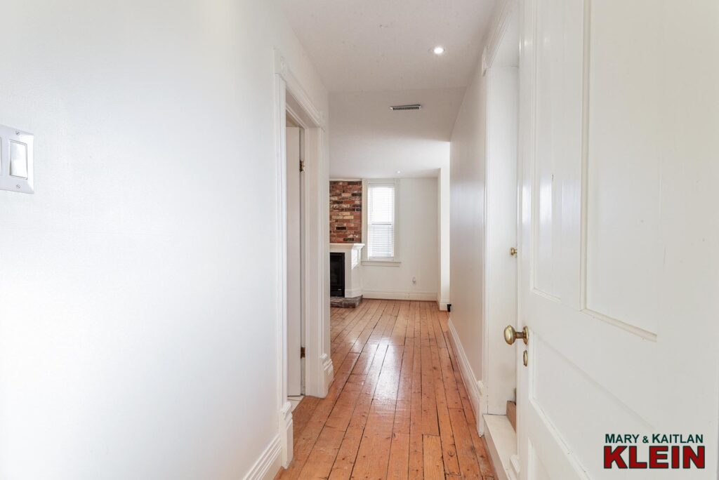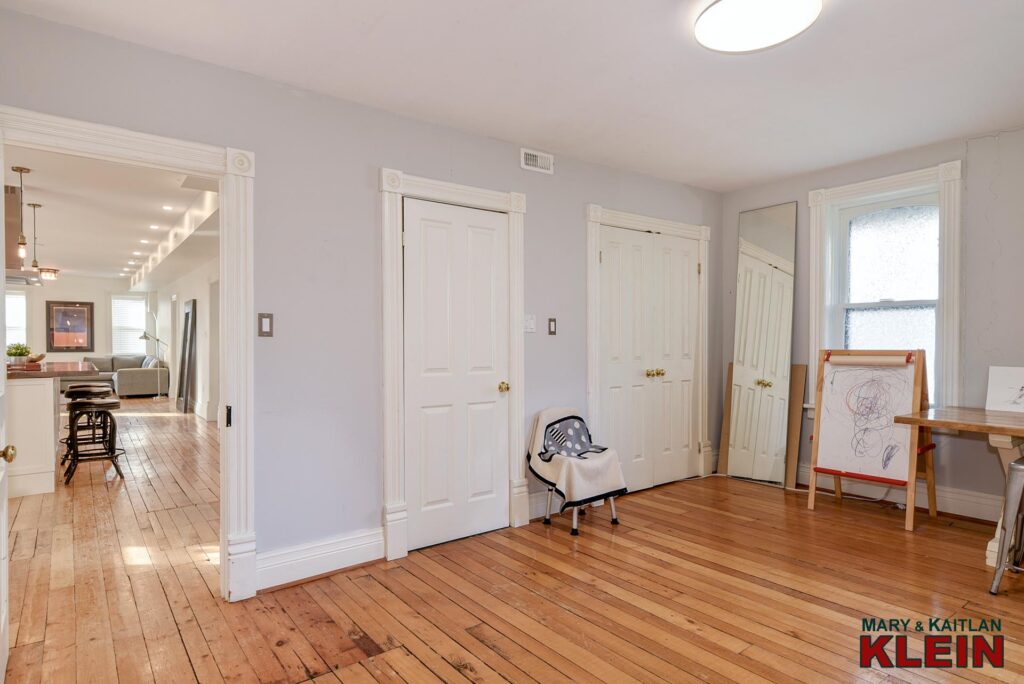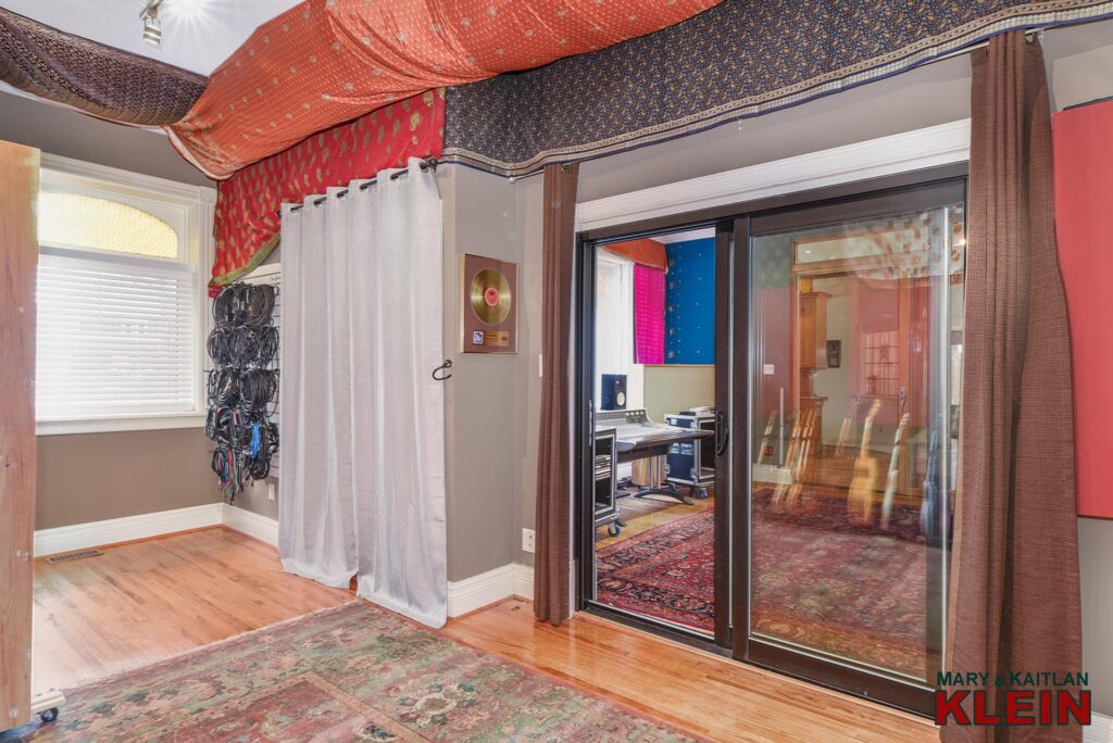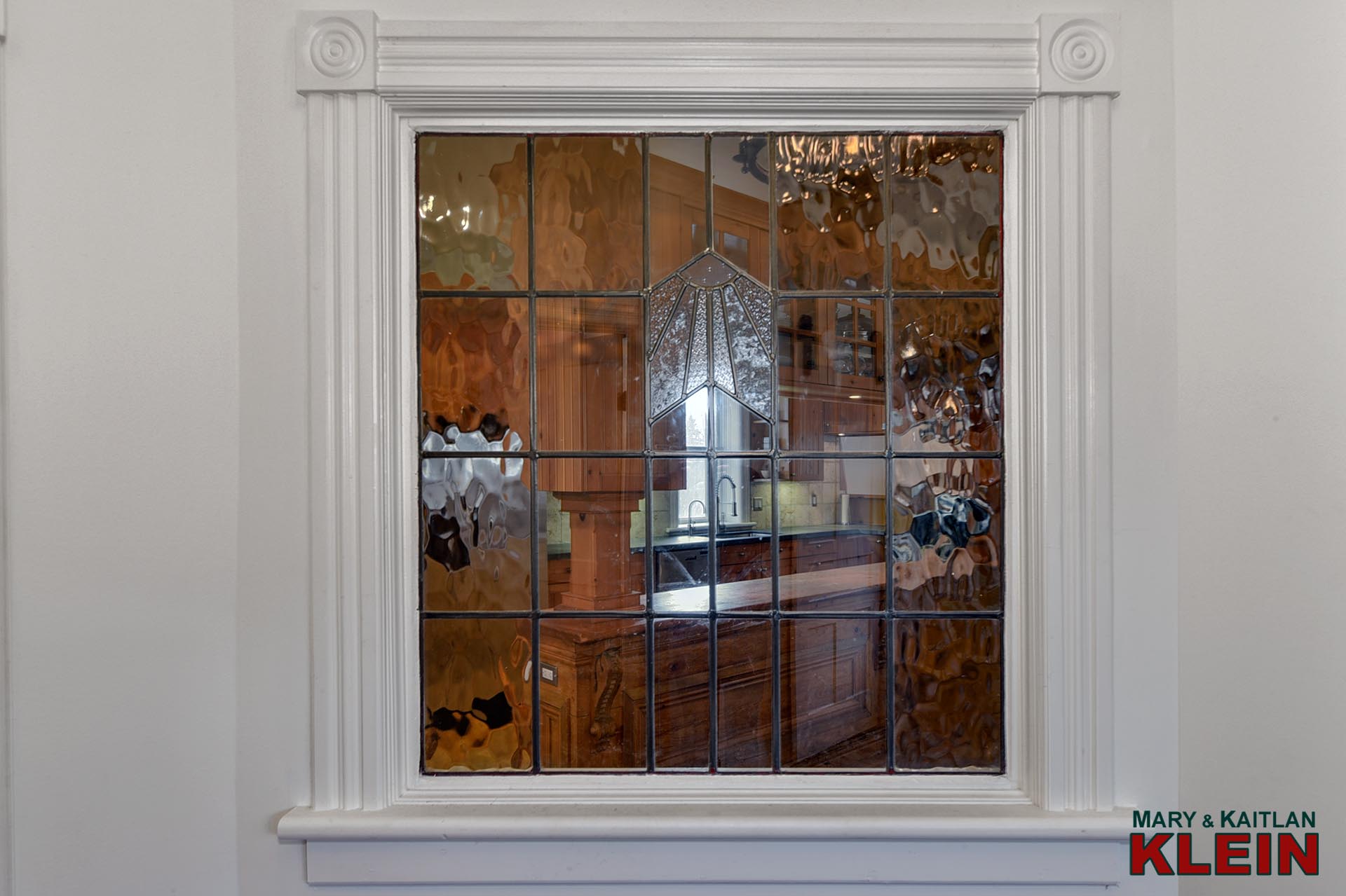 The Foyer is located off the driveway and features a beautiful custom front door (‘24). Original maple wood floors, pot lighting, a stained-glass focal point,10 ft. ceilings with rustic wooden accent beams welcome you to this impeccably maintained home exuding warmth and character.