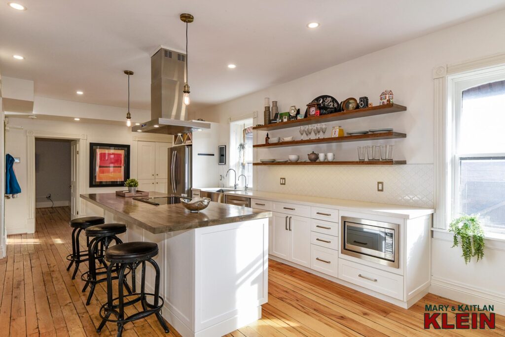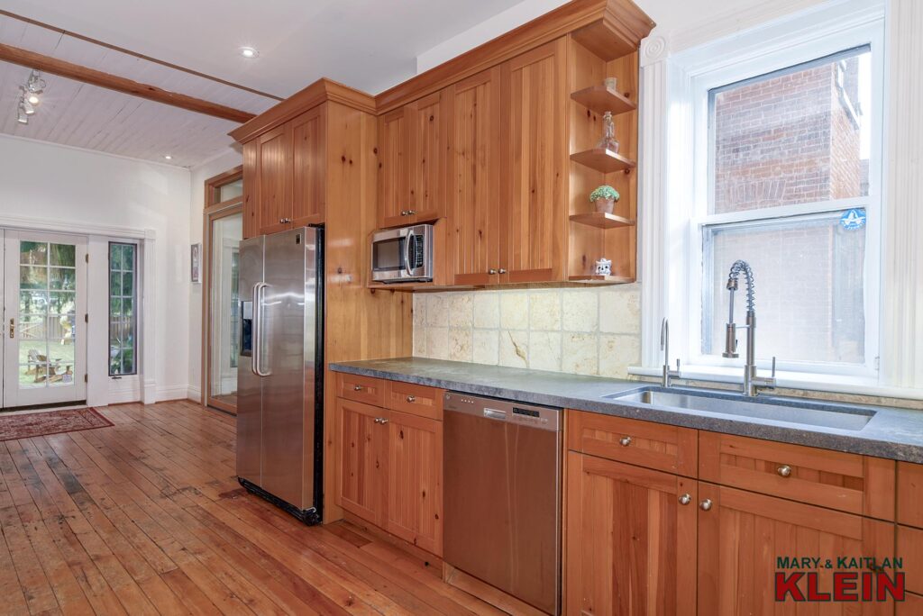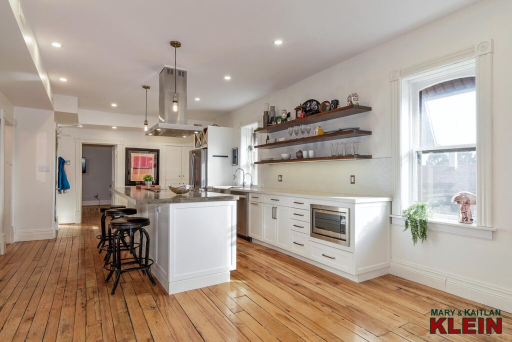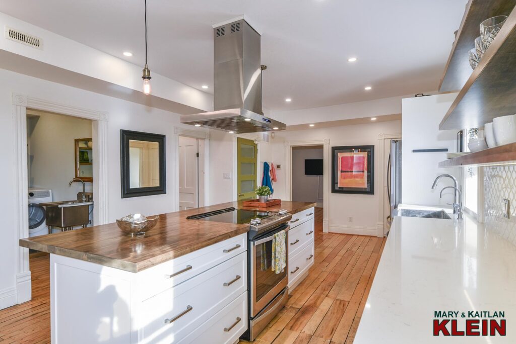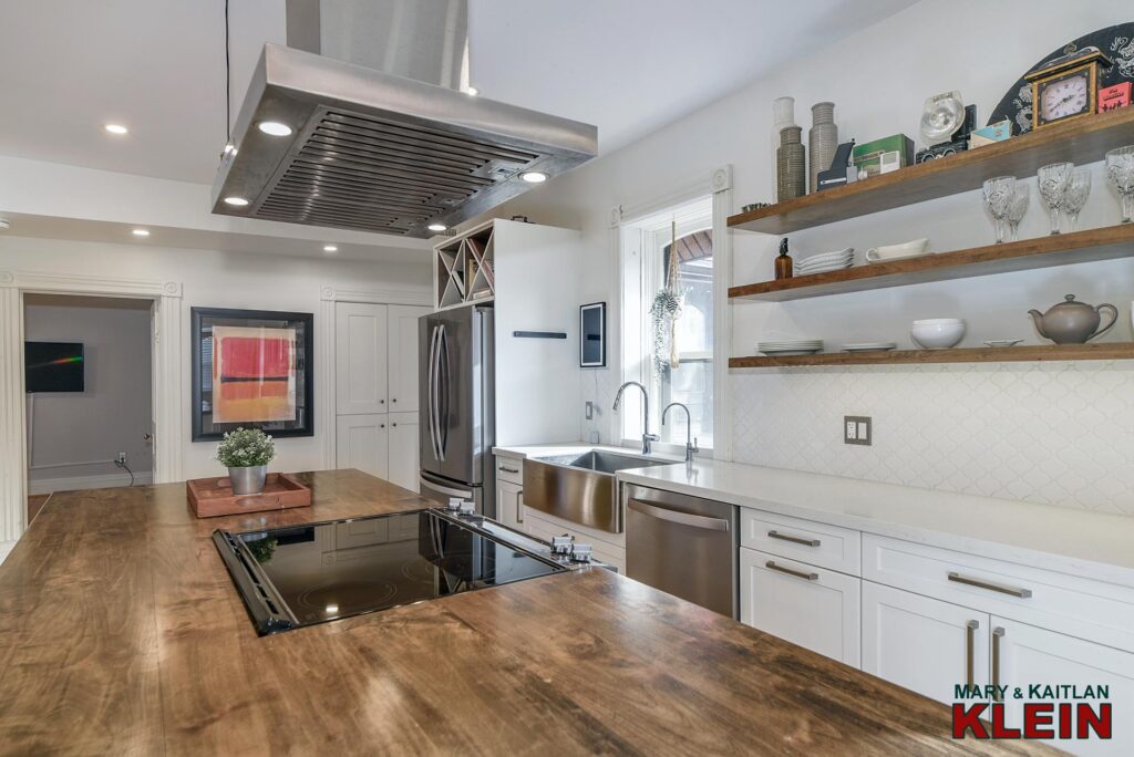 Renovated by Alair Homes in 2019, the upstairs features refinished maple flooring, a custom Kitchen with a farmhouse sink, quartz and butcher block countertops, tile backsplash, pot lighting, a breakfast bar and is open to the large Living room.