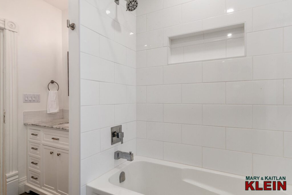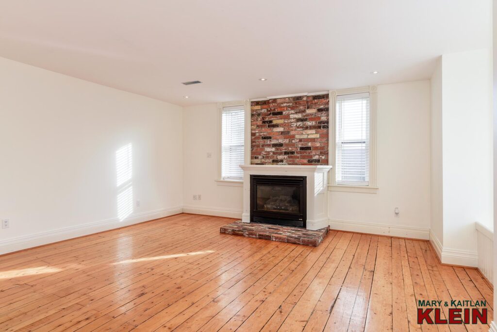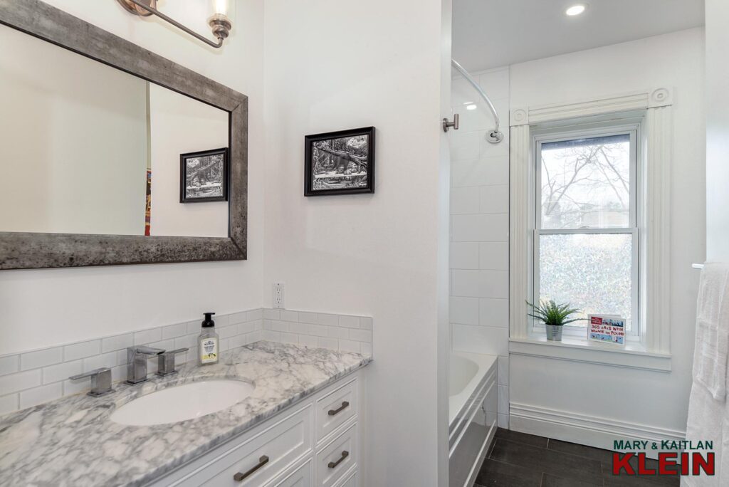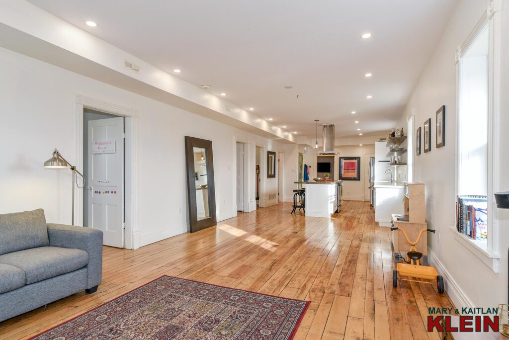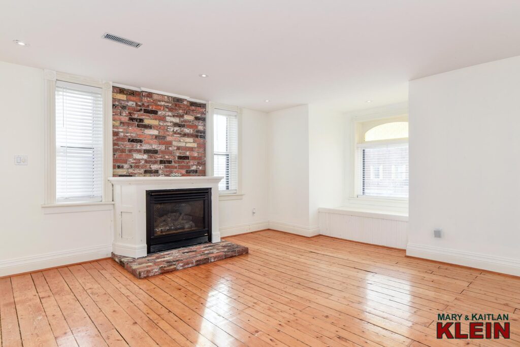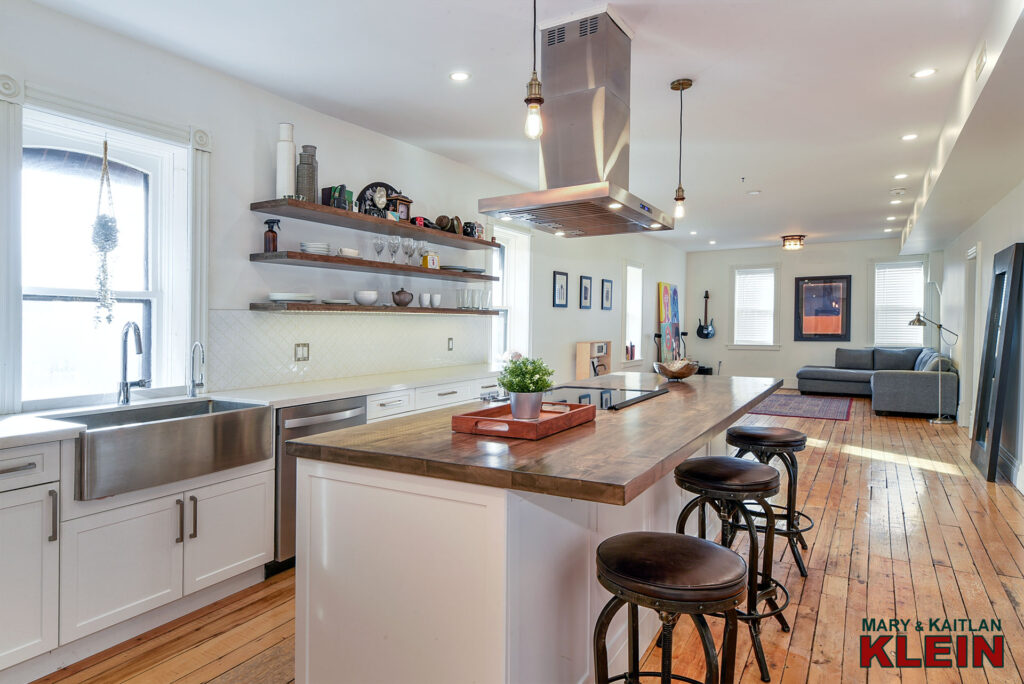 Renovated by Alair Homes in 2019, the upstairs features refinished maple flooring, a custom Kitchen with a farmhouse sink, quartz and butcher block countertops, tile backsplash, pot lighting, a breakfast bar and is open to the large Living room.