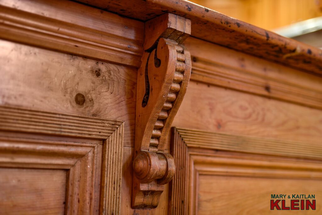 The inviting pine country Kitchen has an abundance of workspace, quartz countertops (‘24), travertine backsplash, stainless-steel appliances, and offers a convenient walk-out to the deck (‘24) and fenced backyard.